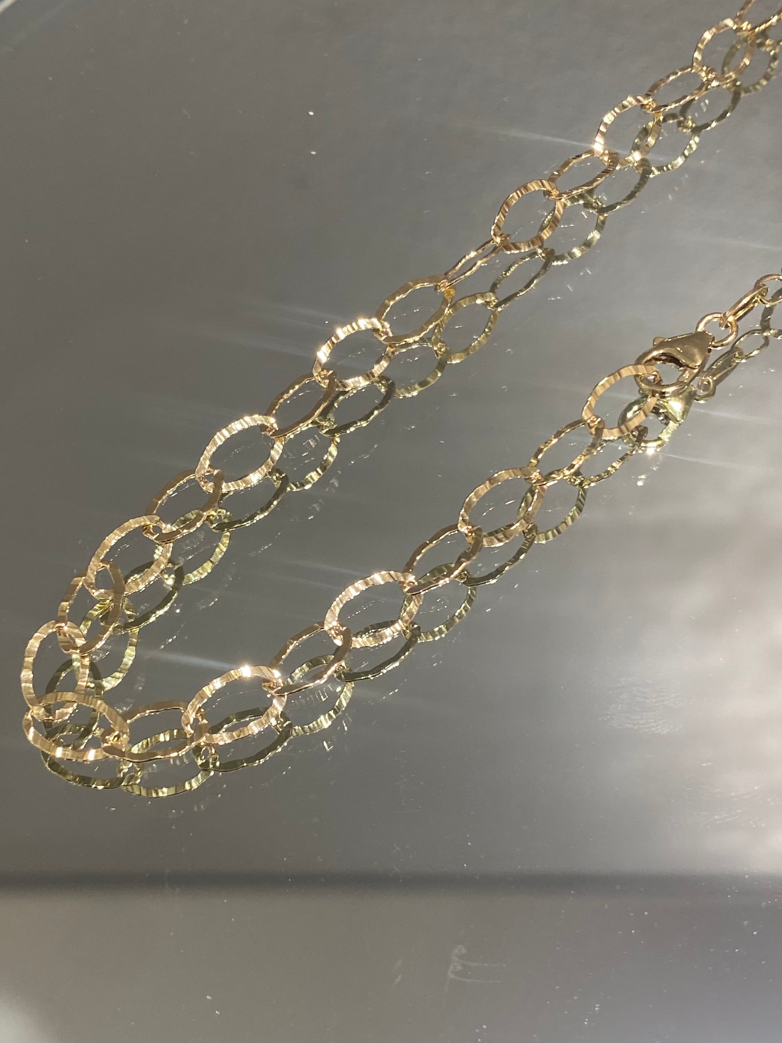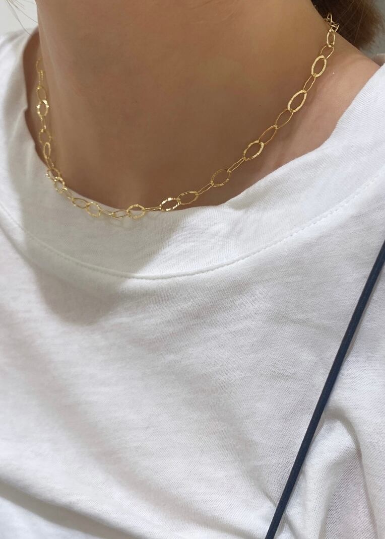 洗練されたデザインのフラットオーバルチェーンネックレスは、上品な光沢感と美しいシルエットが