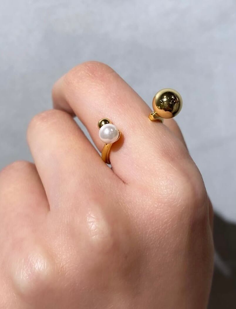 立体感が可愛いリングです。個性的なデザインですが、トップがオープンになっている為、手元に抜け感もだしてくれます。人と被らないデザインや、いつもと違った雰囲気のリングを探している人にオススメです。