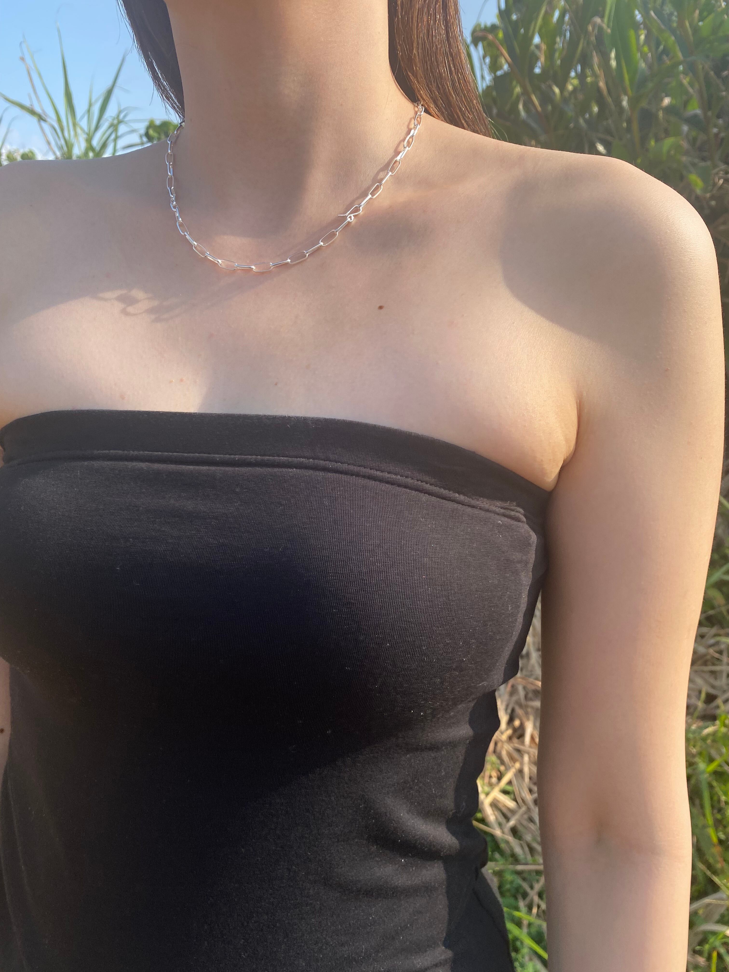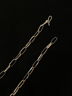 チェーン部分どこでもフックで留めれる為、長さは自由自在です。お持ちのお洋服の首元の空き具合に合わせて