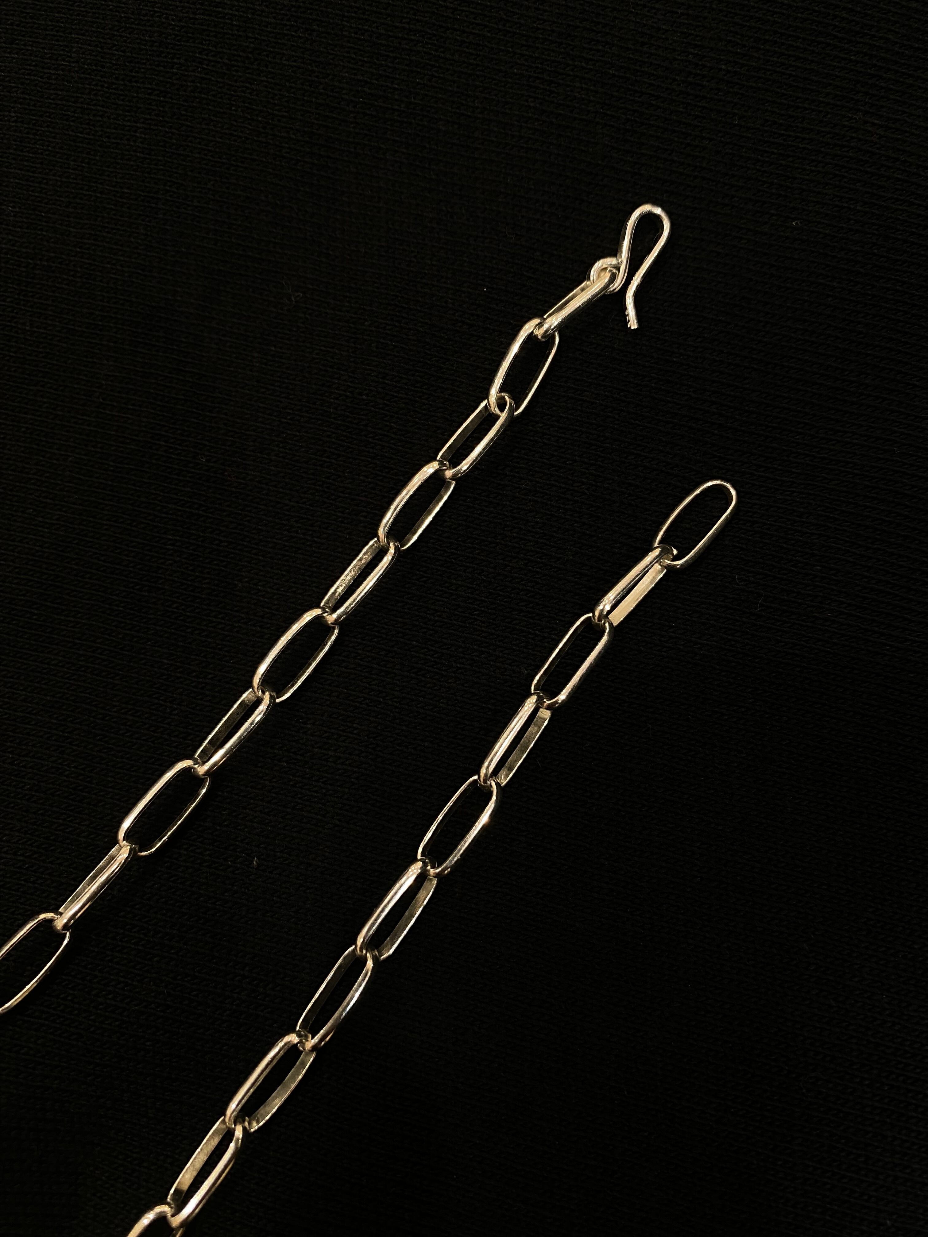 チェーンの途中でフックを留めて、Y字のように前に垂らしたり、ショートの方や髪をアップした際は後ろに垂らして着用頂いても雰囲気を変えて着用頂けます。