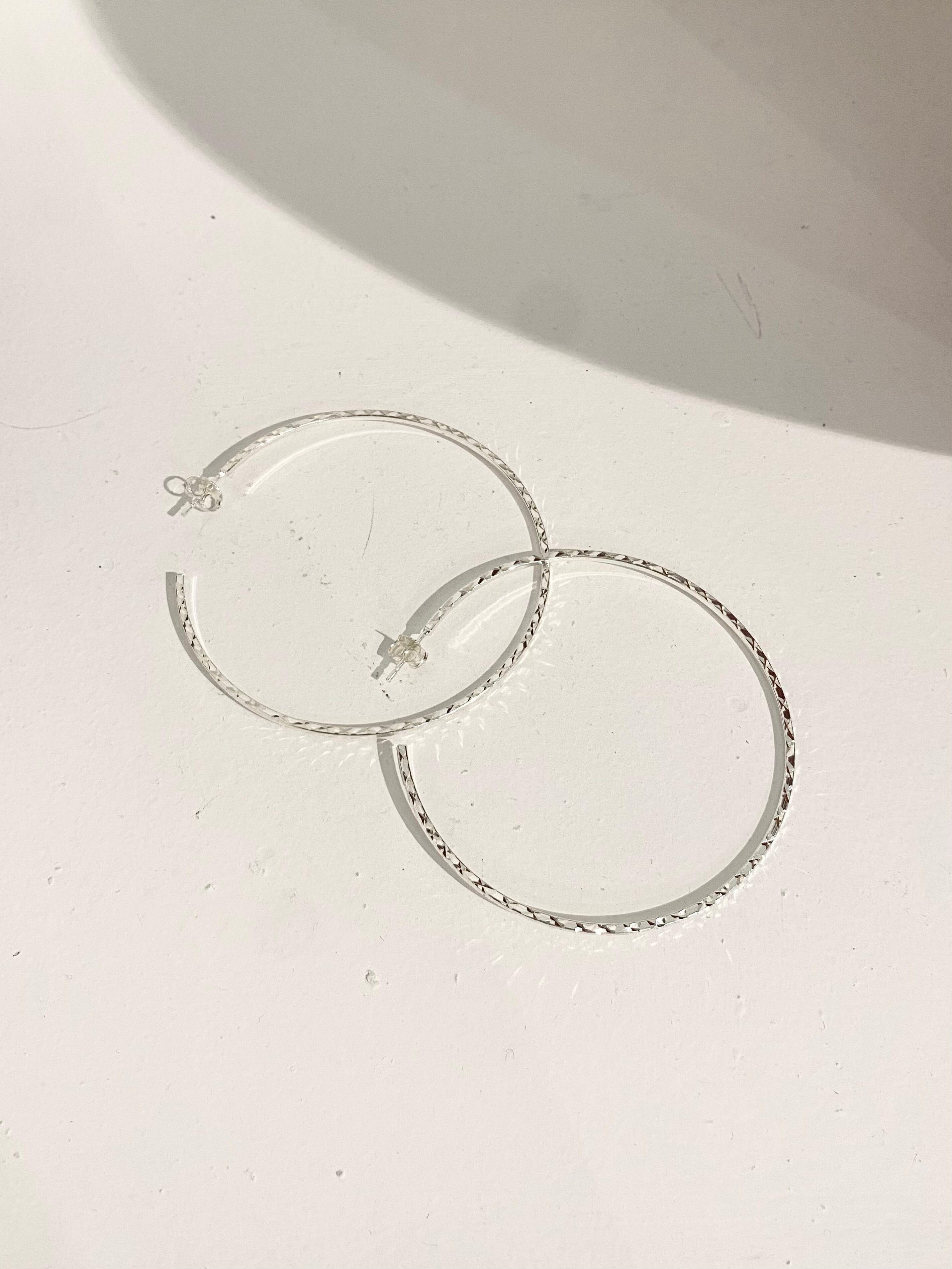表面のカッティングが輝きを放ち、シンプルながらも程よくボリューム感もあるフープピアスです。コーディネートのアクセントに。