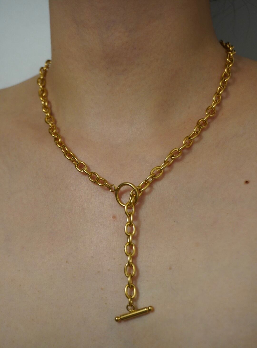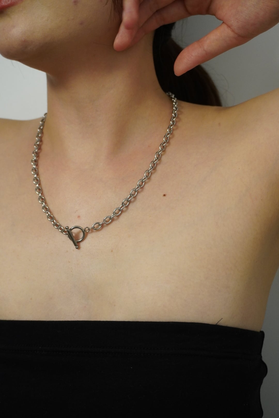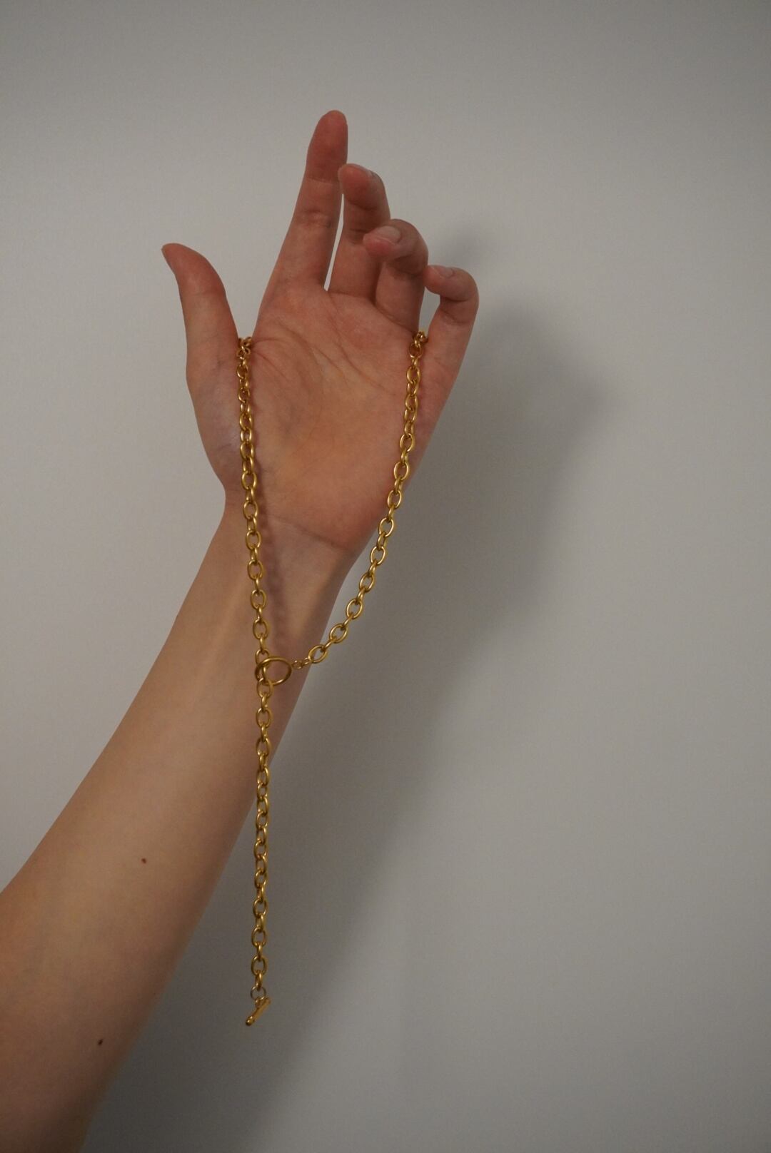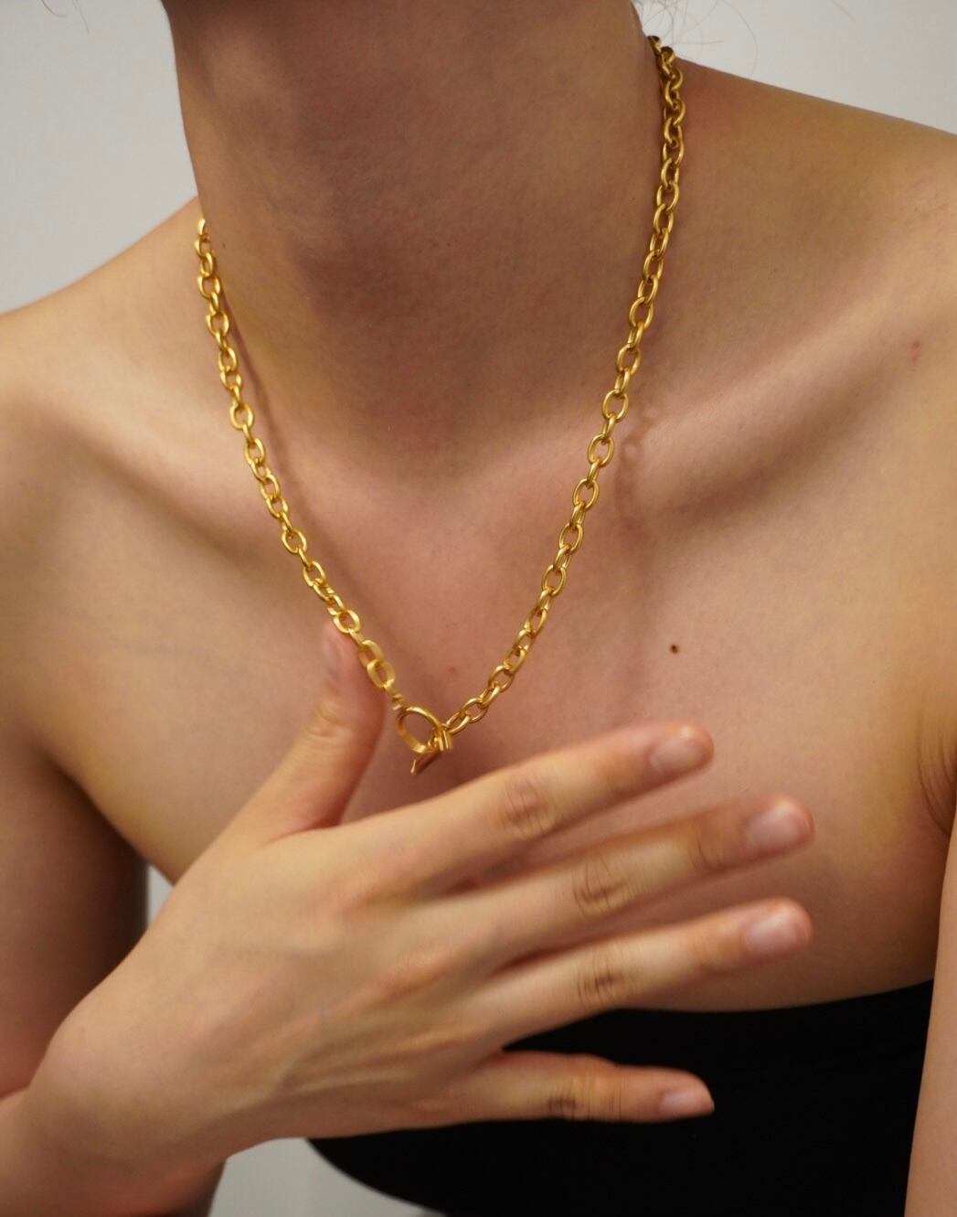 程よいボリューム感のあるネックレスでデコルテを華やかで綺麗に見せてくれます。マンテルの金具の位置を変える事で色んなアレンジをお楽しみ頂けます。